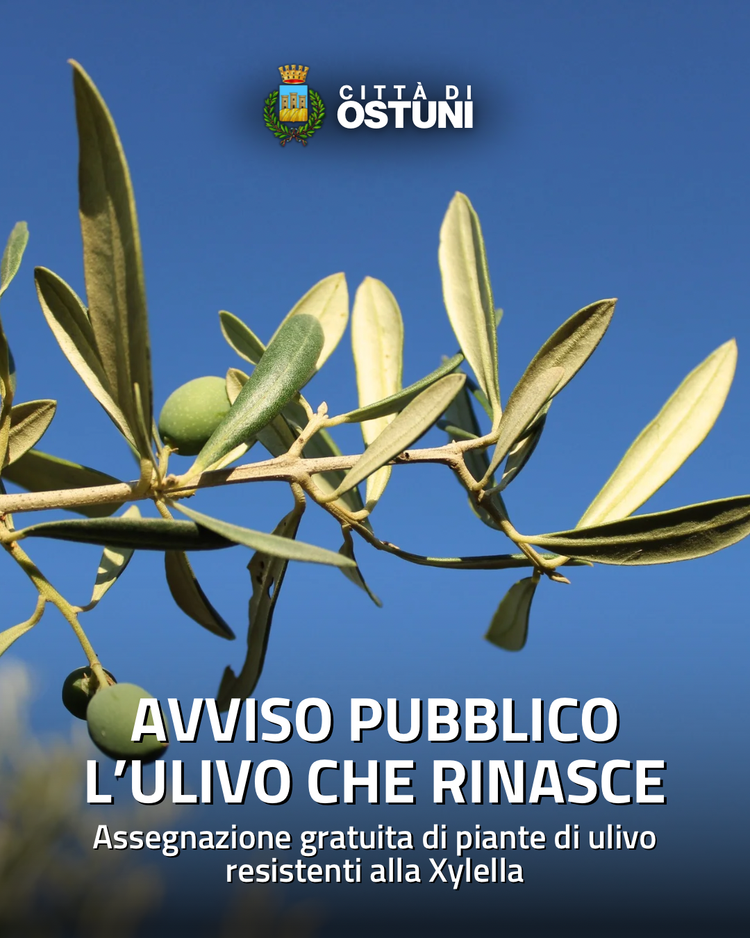Il Comune di Ostuni proroga al 12 dicembre 2025 il termine per partecipare all’avviso “L’Ulivo che Rinasce”, il progetto per la rigenerazione olivicola e la riqualificazione del paesaggio rurale. Domande tramite modulo ufficiale.