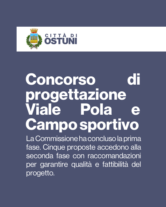 Pubblicato il bando di concorso di progettazione per la riqualificazione urbana di Viale Pola, del Campo sportivo e delle aree contermini con l’obiettivo di acquisire una proposta ideativa (Masterplan) e un progetto di fattibilità tecnica ed economica.